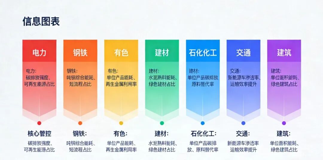 率先实行“碳双控”的行业,以“排放量高、转型潜力大、管控基础好”为核心筛选标准,优先覆盖电力、钢铁、有色、建材、石化、化工等工业行业,同时兼顾城乡建设、交通运输等重点领域,各行业管控重点各有侧重、精准施策。